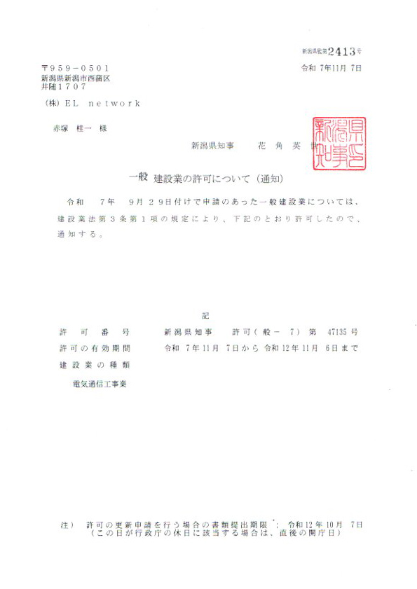 | 免許 | 新潟県知事 許可(般ー7)47135号 |